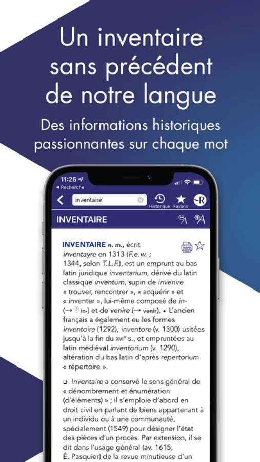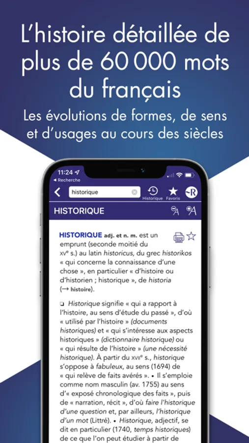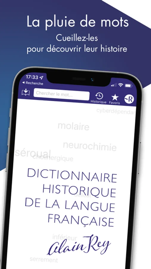 Le Dictionnaire historique de la langue française constitue un inventaire sans précédent de notre langue, de sa richesse, de ses origines souvent inattendues et de son évolution. Il offre plus de dix siècles de voyage de la langue, à travers l’histoire détaillée de plus de 60 000 mots désormais accessibles sur vos appareils mobiles. Naviguez d’un mot à l’autre d’un simple clic pour partir à la découverte de ces fabuleuses histoires ponctuées d’anecdotes en tout genre.