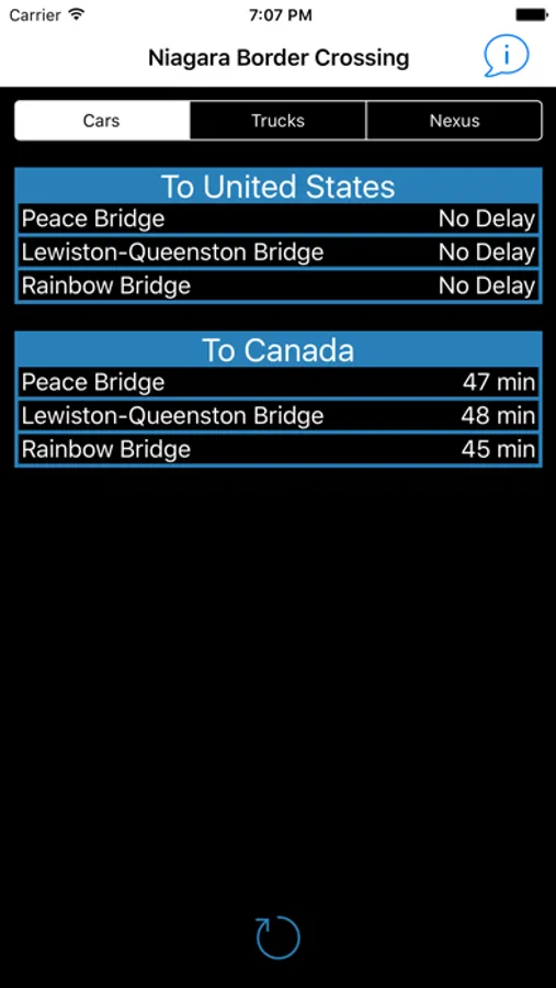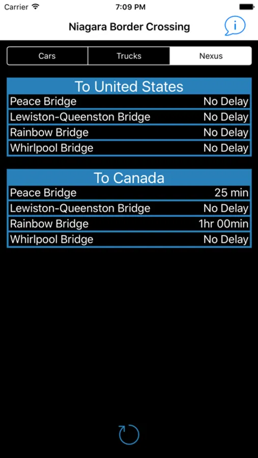 Wait times are shown for all four of the bridges that connect Western New York with Southern Ontario. These include the Lewiston-Queenston Bridge, the Whirlpool Rapids Bridge, the Rainbow Bridge, and the Peace Bridge. Separate times are shown for cars, trucks, and also for those using the Nexus lanes.