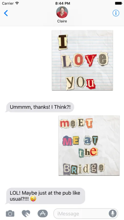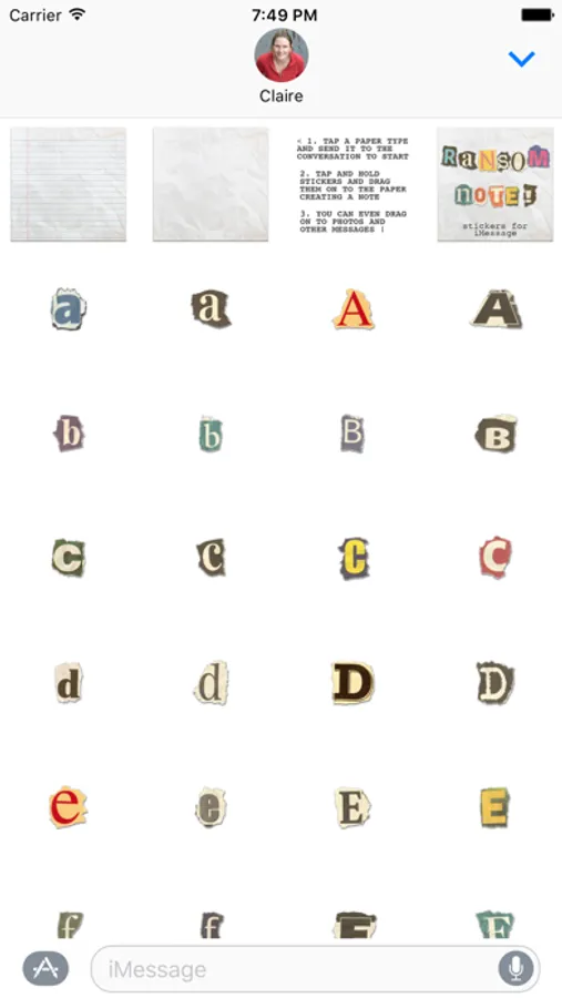 Once in the conversation tap and hold each character sticker and drag on to the paper to build your ransom note! Or add over existing speech bubbles and photos!