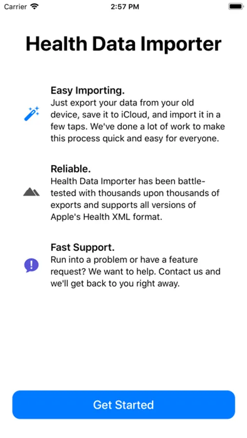 Health Data Importer is the easiest, fastest, and most reliable way to transfer your Health data from your old phone to your new one. Don't depend on other apps that might lose your data—Health Data Importer is battle-tested with thousands of users and supports all versions of Apple's Health XML format. Start fresh without a backup when you get your new device and easily import your existing health data. Health Data Importer imports all Health data except Activity Summaries, Stand Hours, Exercise Time, and Nike Fuel data (these are API limitations).