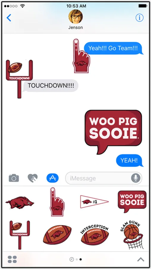 This is an officially licensed Sticker Pack from the University of Arkansas. Sticker packs include the Arkansas logo, Arkansas branded footballs and basketballs, football goal posts, chat bubbles and more. These stickers can be used in iMessage to show your school spirit both in text messages and on photos. Just drag them onto your message thread and they will be shared instantly with whomever you are messaging with. Have fun and Go Hogs!!