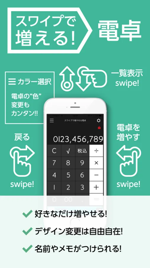 ・電卓を好きなだけスライド(スワイプ)で増やすことができます。