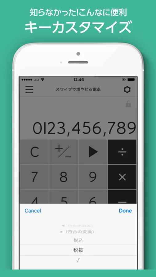 「C」の右隣にあるキー2つは長押しすることでお好きなキーに変更することができます。「√」「税抜」「税込」「±」「一時消去」の5つからお好きな2種類をアサイン可能です。
