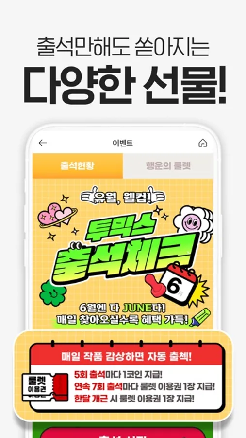 ◆ 출석만하면 누구나 받을 수 있는 무료코인과 행운의 룰렛이용권!