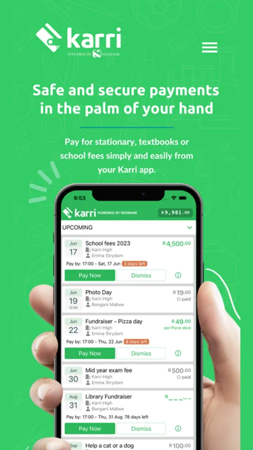 - Pay for stationery, textbooks or school fees simply and easily from your Karri app.