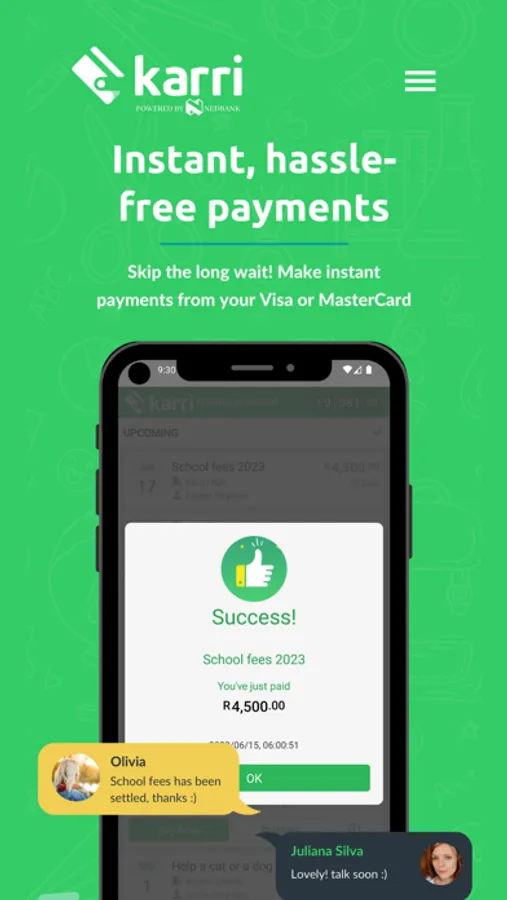 Karri allows you to make safe, quick and convenient payments back to your school or other community organization. So far, we’ve removed millions of dollars of cash from schools in South Africa and Australia. Download the app, register an account (in less than 60 seconds), choose your preferred payment mechanism and make an instant payment back to your organization.