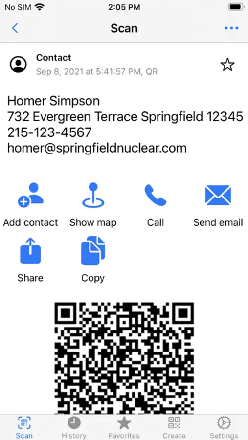 Other functionality of QR code reader / QR code scanner: Create QR code, Scan QR from image, Scan QR from Gallery, Share your contact info via QR, generate QR codes from clipboard content.