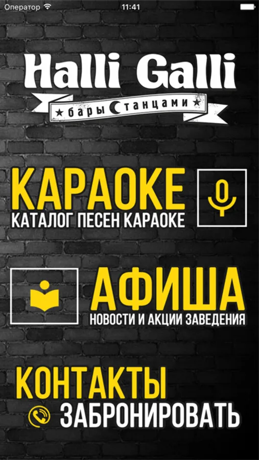 Фирменное приложение для караоке-бара "Halli Galli". Только в этом приложении все самые актуальные новости заведения, а также всегда горячие акции и различные скидки. Помимо этого пользователи смогут оценить удобство каталога песен, ведь с его помощью любимая композиция находится за считанные секунды. Также пользователю даётся возможность составлять свой репертуар из любимых песен, чтобы они всегда были под рукой.
