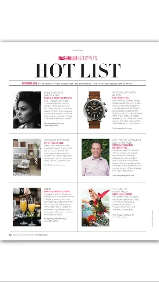 Nashville Lifestyles is the exclusive city magazine for the greater Nashville area. Features include local issues, dining, celebrities, fashion, homes, and neighborhoods, events and much more! In addition to the regular features, readers enjoy special issues like Top Doctors, the 25 Most Beautiful People, Single in the City & The Music Issue.