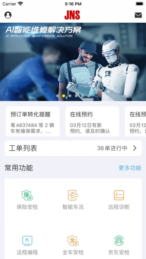 JNS针对中国维保企业服务车型复杂、服务项目单一的困境,提供一套综合系统帮助维保企业走出困境,通过为万国车提供全生命周期服务,对汽车产业各个环节的信息对接,为传统的维保企业提供一套能够解决日常管理、汽车检测、智能诊断、终端技术支持、零配件采购、二手车买卖等业务的综合服务系统。