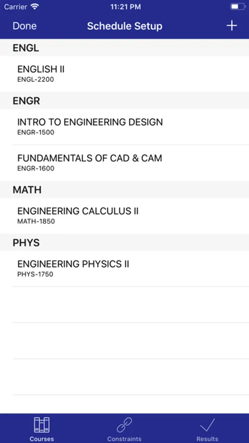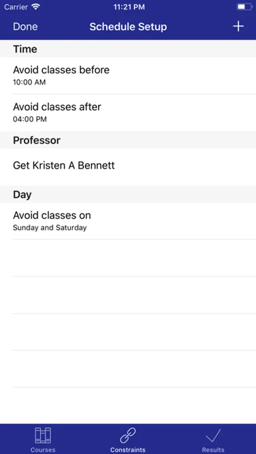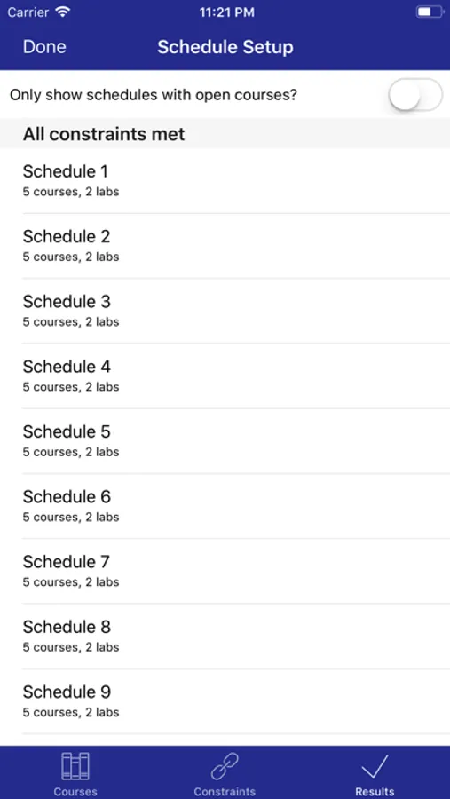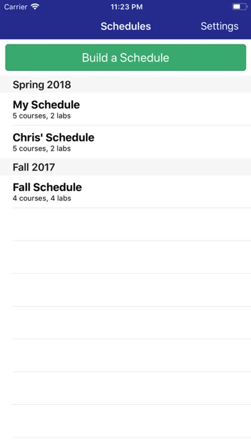 With College Schedule Builder (CSB for short) you're in control of your next semester. Pick from our wide list of colleges, and find schedules faster than before with our specialized algorithm. You tell us what courses you need to take during our semester, when you're free for classes, and what professors you want. In the blink of an eye, CSB checks which combinations fit your preferences, and serves you the best options. If you find one you like, you can instantly save it to your phone for later.