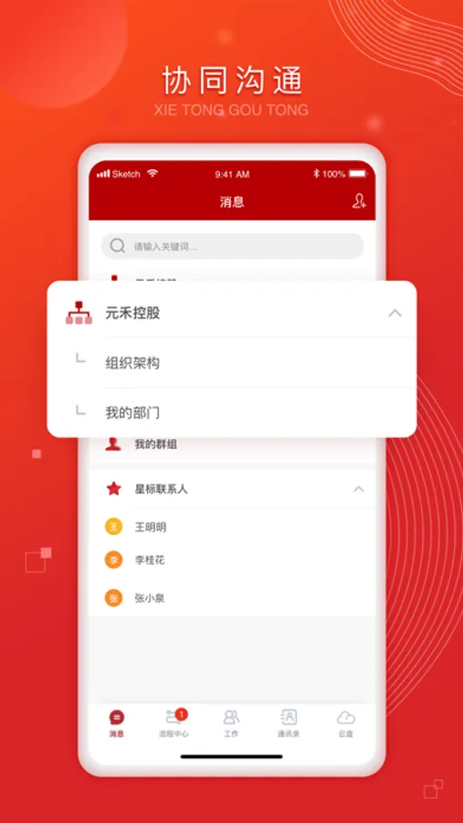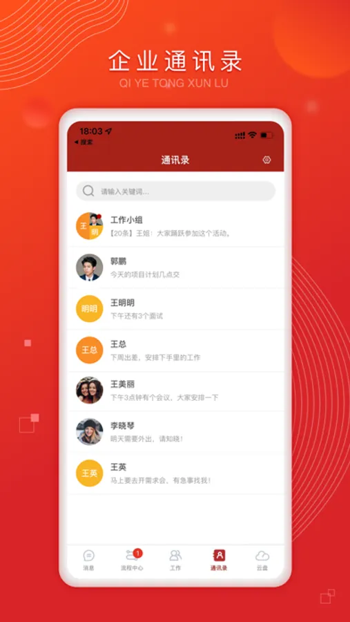 2.通讯录:企业/团队组织架构一目了然,可以直接拨打电话发送邮件。