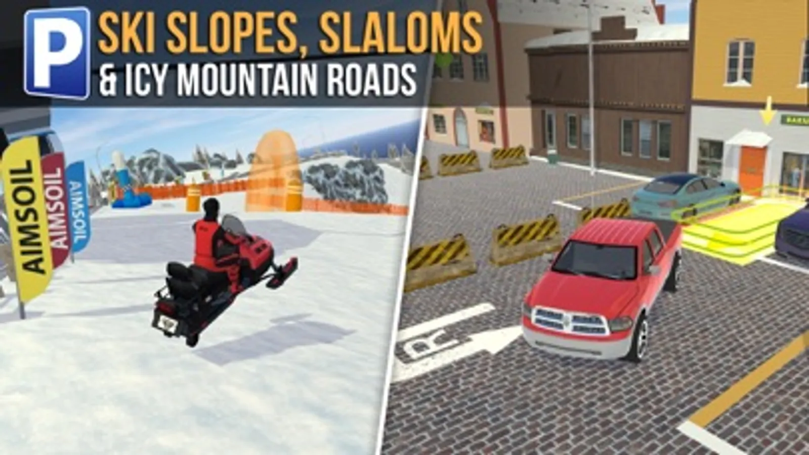 Welcome to the Ski Resort Village. Start your Vacation Today! Drive & Park a HUGE roster of ‘Winter Vehicles’ around the cute snow covered ski village. Park cars, trucks, snow plows, gritters, cars & caravans, busses and even a super-quick snowmobile! Discover mountain roads, beautiful chalets, hotels, ice skate rinks, ski slopes and slaloms!