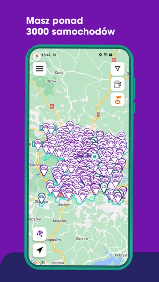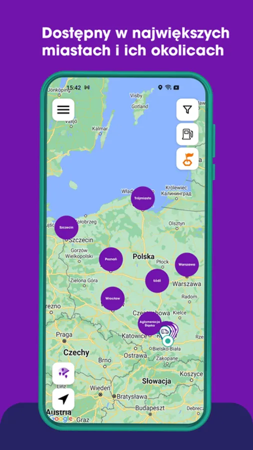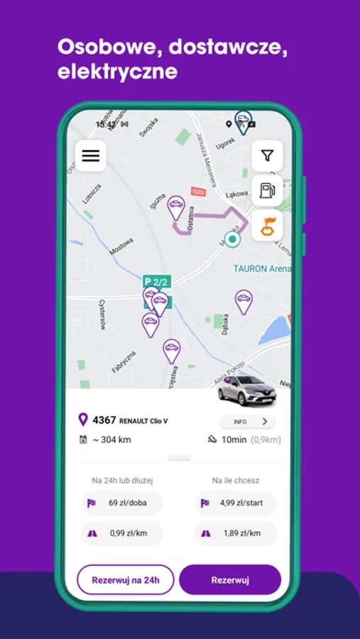 Jesteśmy dostępni na terenie największych polskich miast. Dzięki aplikacji masz samochód dokładnie wtedy, kiedy jest Ci potrzebny. Jednym kliknięciem rezerwujesz jedno z aut widocznych na mapie, parkujesz i płacisz tylko wtedy, gdy używasz. Nie musisz przejmować się kosztami paliwa, przeglądami technicznymi, ubezpieczeniem, garażowaniem czy opłatami za miejskie parkomaty. Przy okazji, przyczyniasz się do zmniejszenia liczby aut na ulicach i zanieczyszczenia powietrza.