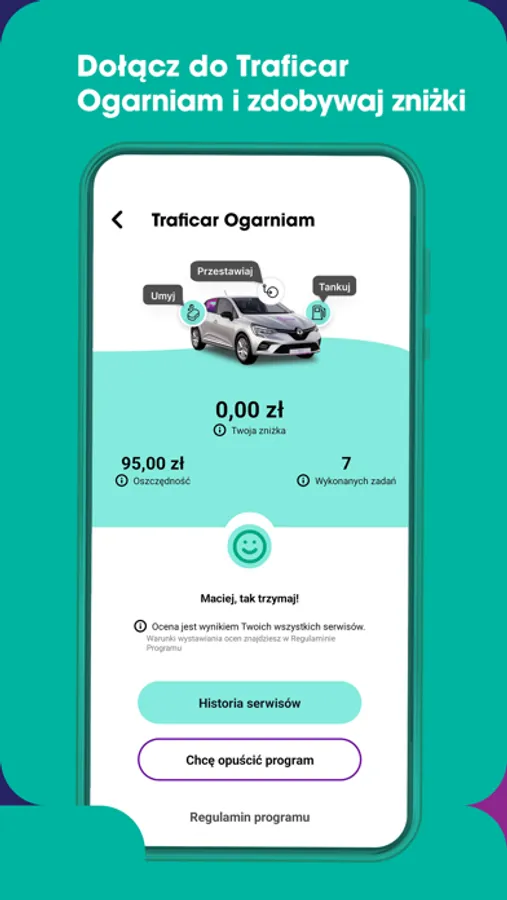 Aplikacja Traficar umożliwia zarejestrowanie konta, znalezienie i zarezerwowanie samochodu, a także otworzenie i zamknięcie auta oraz sprawdzenie historii podróży.