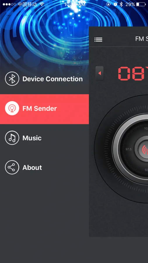 1. Device Connection: FM transmission control, by phone control FM frequency point, push your own music, create you own radio station.