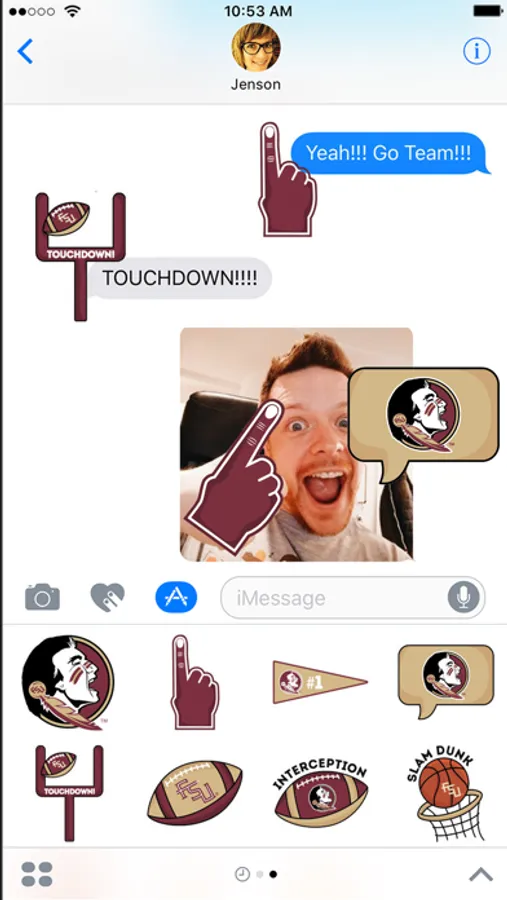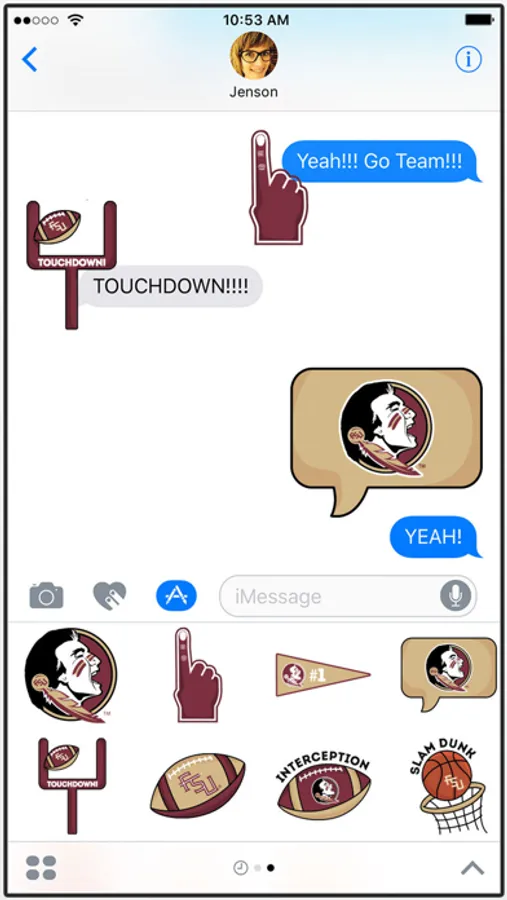 This is an officially licensed Sticker Pack from Florida State University. Sticker packs include the Florida State logo, Florida State branded footballs and basketballs, football goal posts, chat bubbles and more. These stickers can be used in iMessage to show your school spirit in both text messages and on photos. Just drag them onto your message thread and they will be shared instantly with whomever you are messaging with. Have fun and Go 'Noles!!