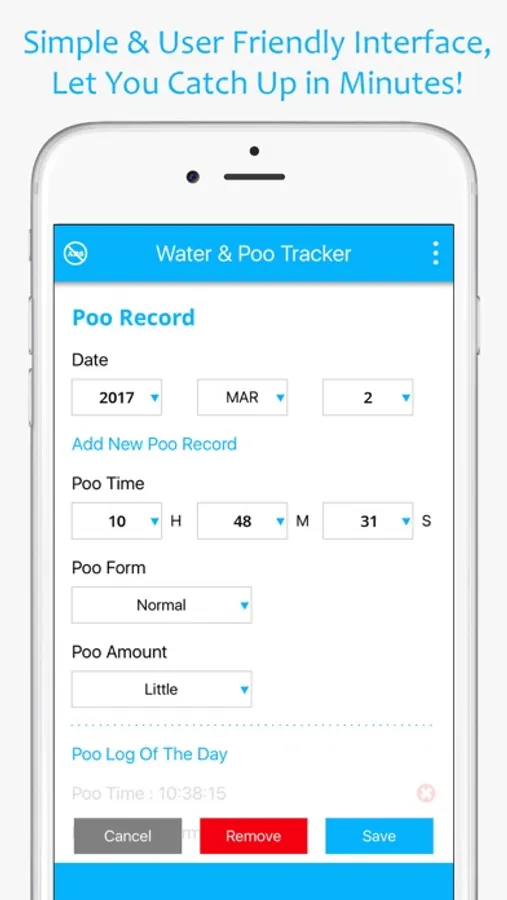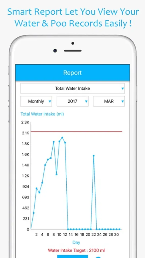 • Smart Report let you view your water intake and poo times according to your preferences such as Daily Water Intake, Daily Poo Times, Monthly Water Intake, Monthly Poo Times……(Pro Version)