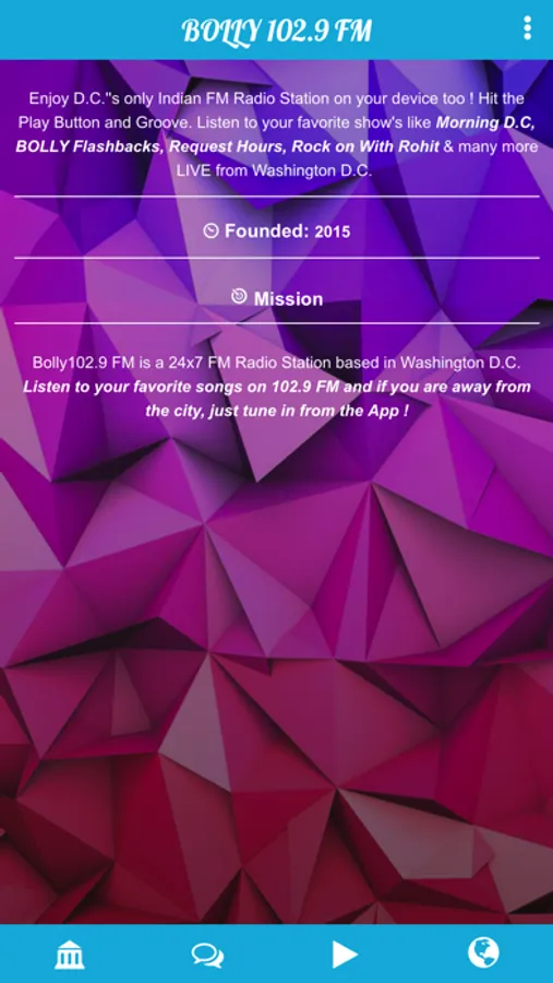 Bolly-FM is Washington D.C.'s leading Desi Radio Station. Download the app today to listen to non stop Hindi, Telegu, Kannada, Tamil and Gujarati Music along with Live Shows for your entertainment !!