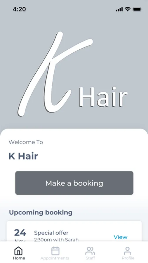 The K Hair app makes booking your appointments and managing your loyalty points even easier. You're just a few taps away from feeling good and looking great!