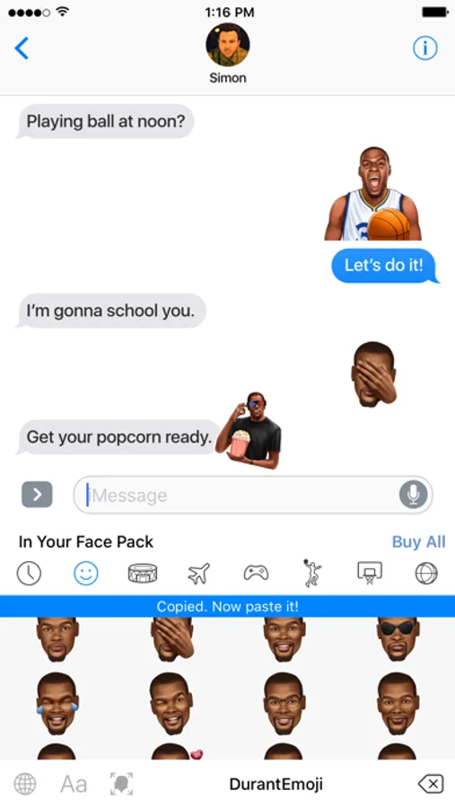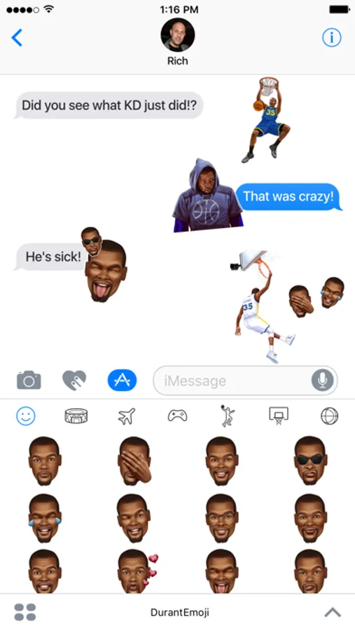 DurantEmoji by Kevin Durant works across all messaging applications where you can copy > paste the images or GIFs from an installed custom keyboard. Have iOS 10 already? You don't have to copy / paste in iMessage, simply SEND the Emojis with your iMessage extension as it's a native thing there!