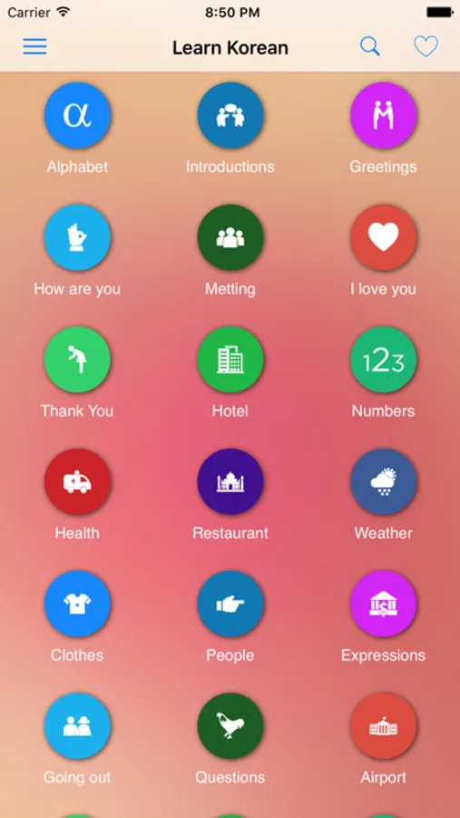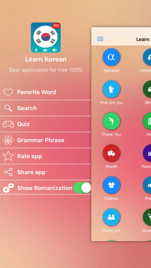 "Learn Korean - Grammar" include over 4000+ phrases with 55 categories(Greetings, How are you, Meeting, I love you, Thank You, Hotel, Numbers, Korean Hotel phrases, Health, Restaurant, Weather, Clothes, Describing people, Love and Romance, Korean Expressions, Going out, Questions, Airport...) serve the purpose at tourists and business people visiting Korean