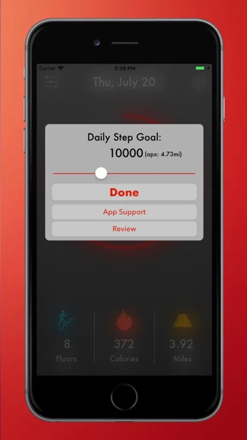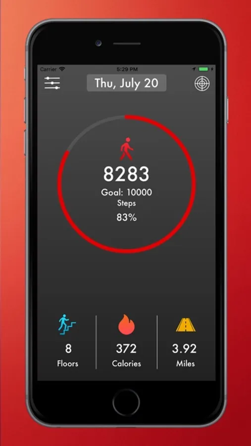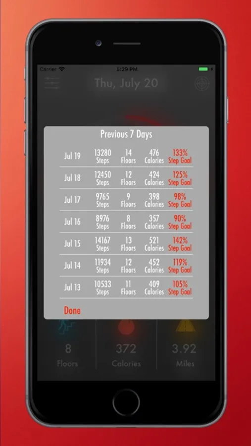 Showing you: Current Steps, Flights Climbed, Distance traveled, and Calories Burned.