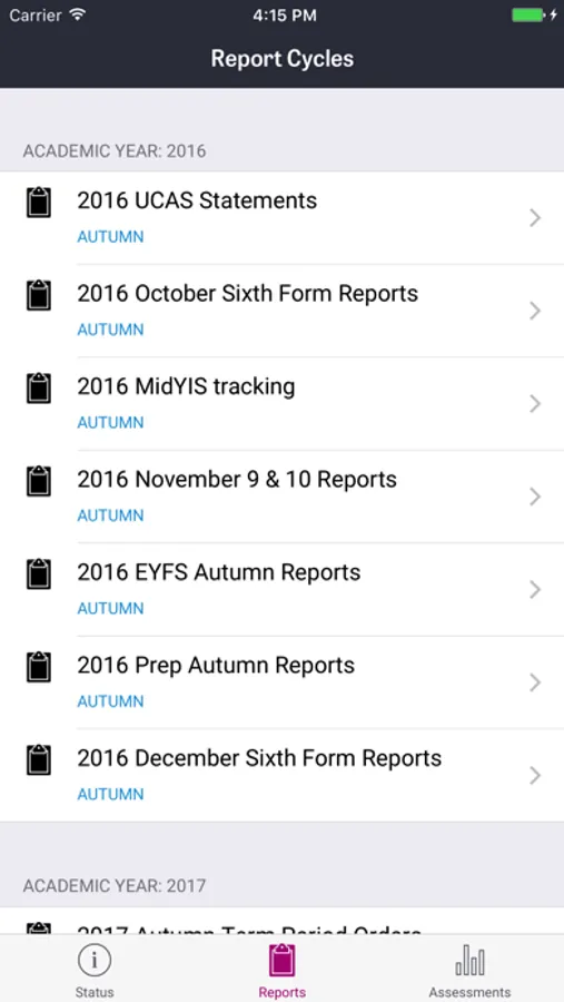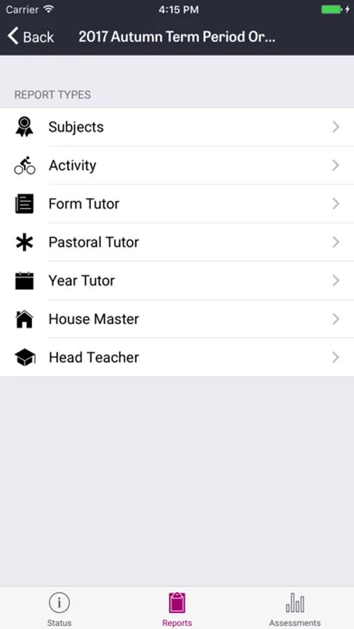 The Reports page displays all active reporting cycles, for example: End of Term Reports. Tapping on each reporting cycle gives the teacher a list of Report Types relevant to that cycle, as well as any associated with their particular role, such as Year Tutor.