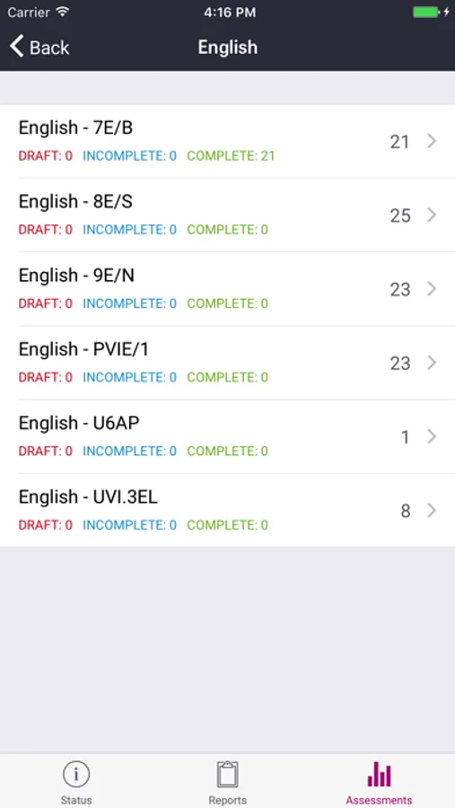 The Assessments page has the same navigation as the Reports page, all the way to individual students’ pages. Each student’s assessment data can be entered directly in the Students page. A footer indicating student totals is displayed, along with buttons to mark all and save all student assessment data.