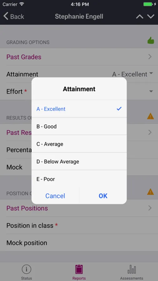 View each student’s past grades, results, options, comments and full reports – useful for quickly commenting on students’ personal progress.