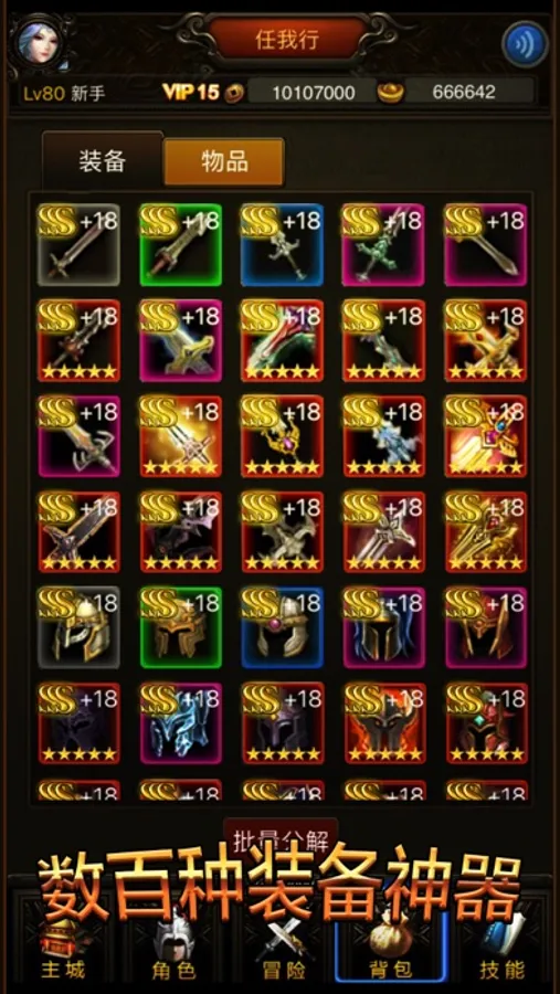 •数百种装备随机掉落,从灰色的普通装备,到红色的神器装备,都是可以掉落的,属性随机。