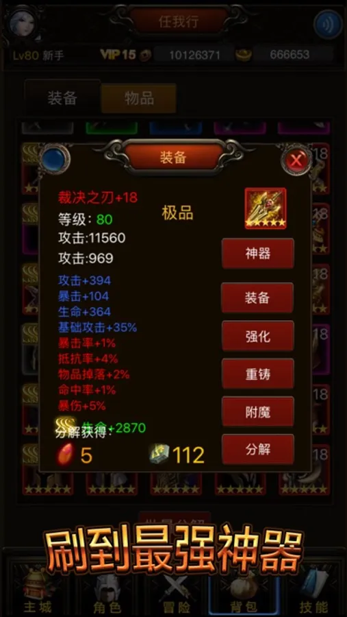•装备分为普通,魔法,精良,传说,史诗,神器几个品质,神器属性随机