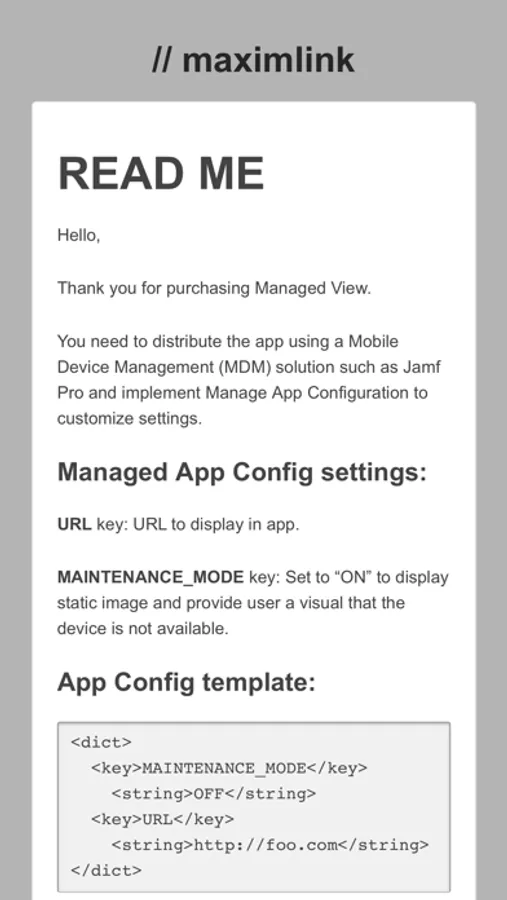 - Built-in maintenance mode with embedded image. Enabled with Managed App Config.