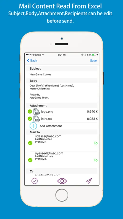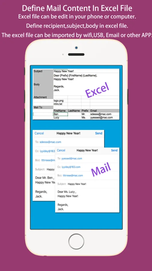 SmartEmail can send personalized bulk email using data from an Excel file.You can personalize the email’s subject and body. For example, if you enter “Hi {firstName}, Happy New Year” in the body, the app will take the first name of the recipients and personalize the body, generating as “Hi Jack,Happy New Year” , “Hi Tom, Happy New Year”…