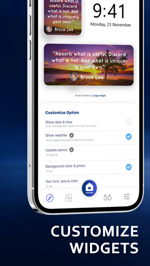 This app provides lock screen and home screen widgets with a complete customization option with lots of custom fonts, colors, as well as a lot of topics to follow like Buddha quotes, Holy Bible, Steve Jobs quotes, inspirational and motivational quotes...