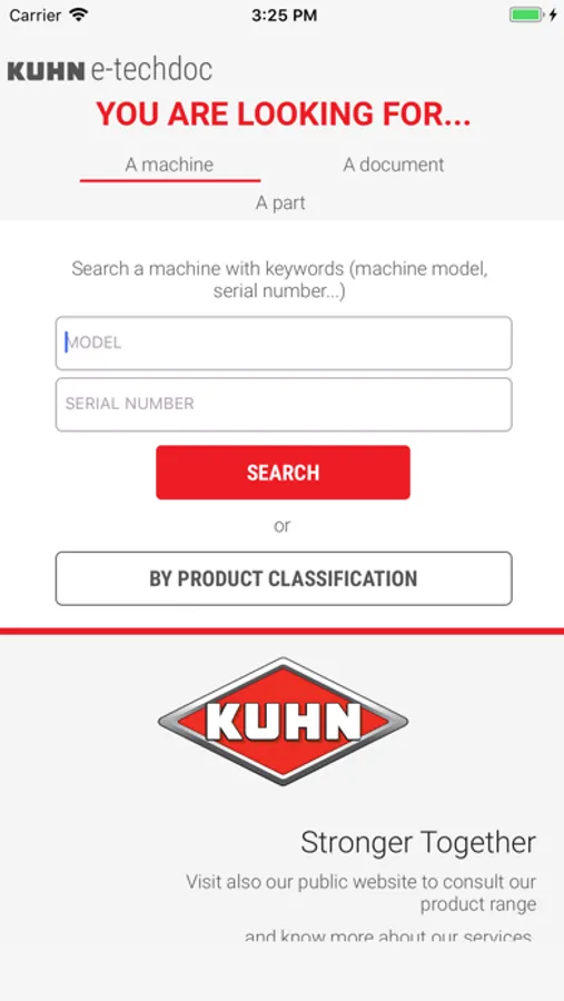 KUHN has developed a database for technical documentation dedicated to partners of KUHN, to help better respond to their needs. This tool, which is continually updated, provides quick access to technical information, 24/7. It is possible to quickly search all technical documents related to a specific product by searching by machine and/or serial number.