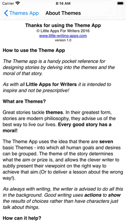 Themes for Writers provides a handy, easy-to-use reference of the seven basic story themes - the part of the story that provides its "moral" and provokes emotional and thoughtful responses from the audience.