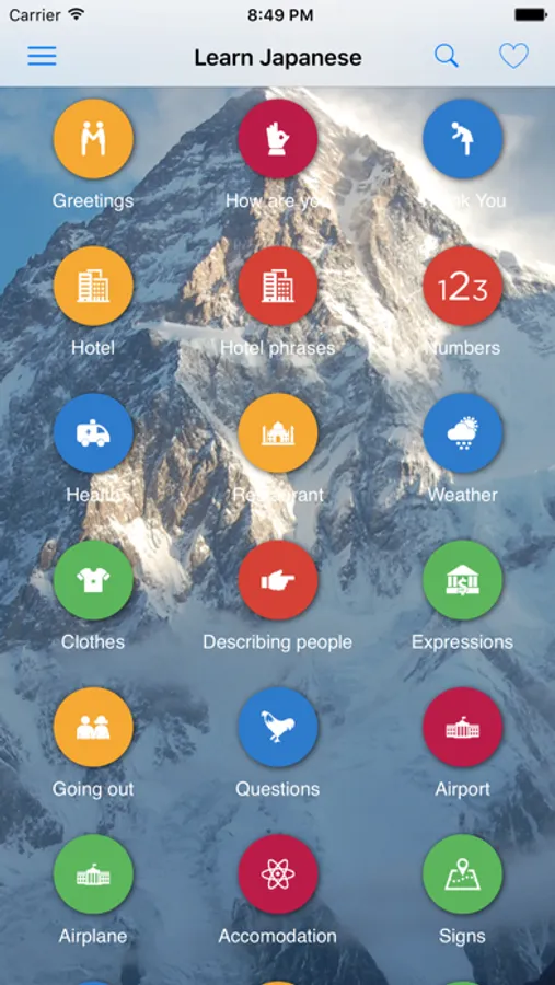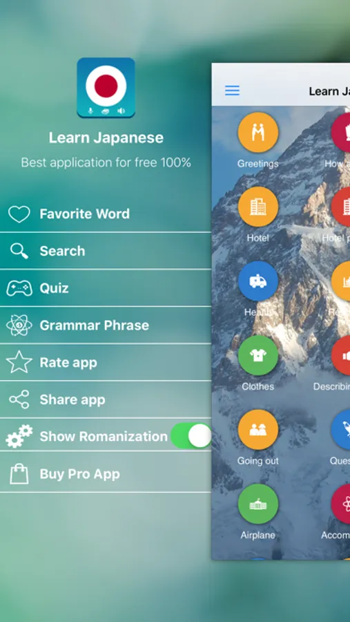 "Learn Japanese Free" include over 4000+ phrases with 51 categories(Greetings,How are you,Meeting,I love you,Thank You,Hotel,Numbers,Japanese Hotel phrases,Health,Restaurant,Weather,Clothes,Describing people,Love and Romance,Japanese Expressions,Going out,Questions,Airport...) serve the purpose at tourists and business people visiting Japan