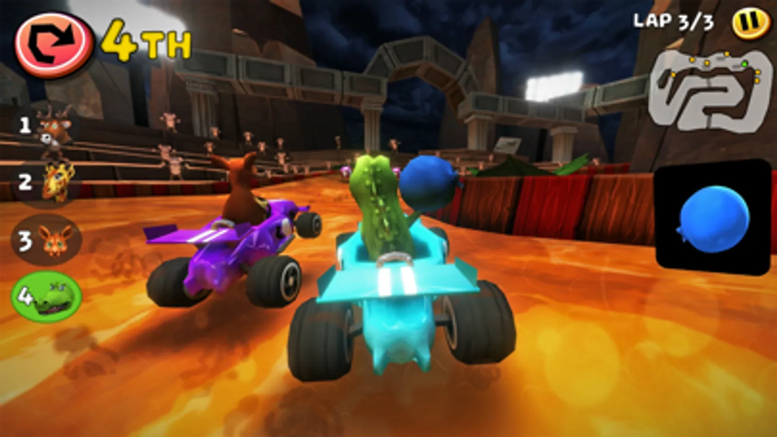 Race from volcanic jungles to freezing cold ice lakes, unlocking new tracks and characters. Can you be the one to champion all of the Cups?