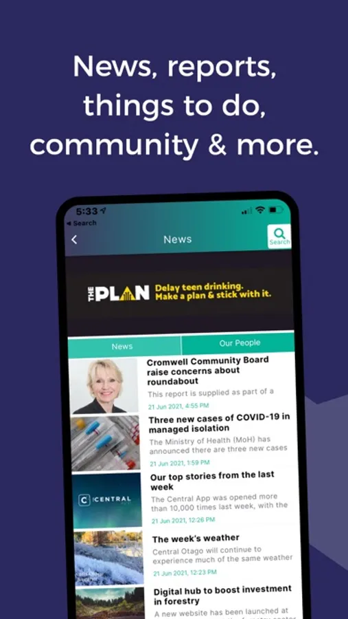 Everything you need to know about living, working and playing in Central Otago - all in ONE place. The Central App features local news, weather, road conditions, information, events and much, much more. Now you've got all the information you need to hand, whenever and wherever you are, all on your smartphone. Download The Central App today (it's FREE!) and stay informed about what's happening in your community.