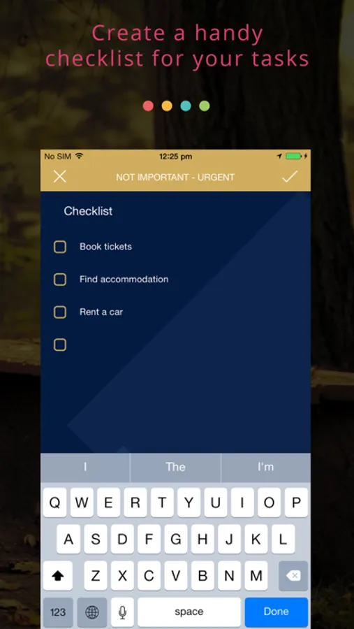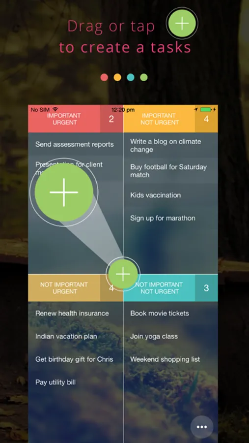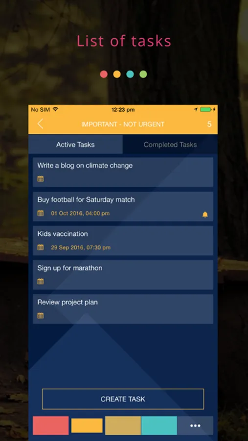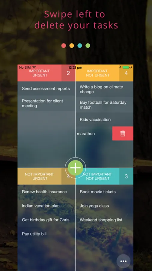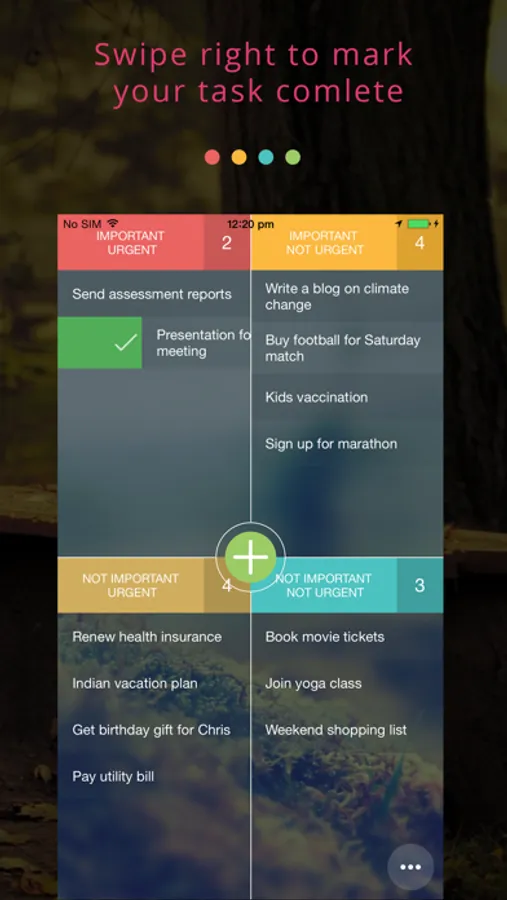 Just drag the ‘+’ icon to any quadrant to create a new tasks. Simple. You can move the existing tasks to other quadrants by dragging the task across. Once you are done with a task swipe right to mark it complete. If you want to delete a task just swipe left. Want to be notified on due dates? select the ‘bell’ icon and set a due date. When a task is due in the next 24 hours it shows a red marker on the task. If the marker is yellow it means that the card is due in the 48 hours. If the due date is beyond 48 hours the marker will be green in color. If you see a blue marker it means there is not due date for that task.