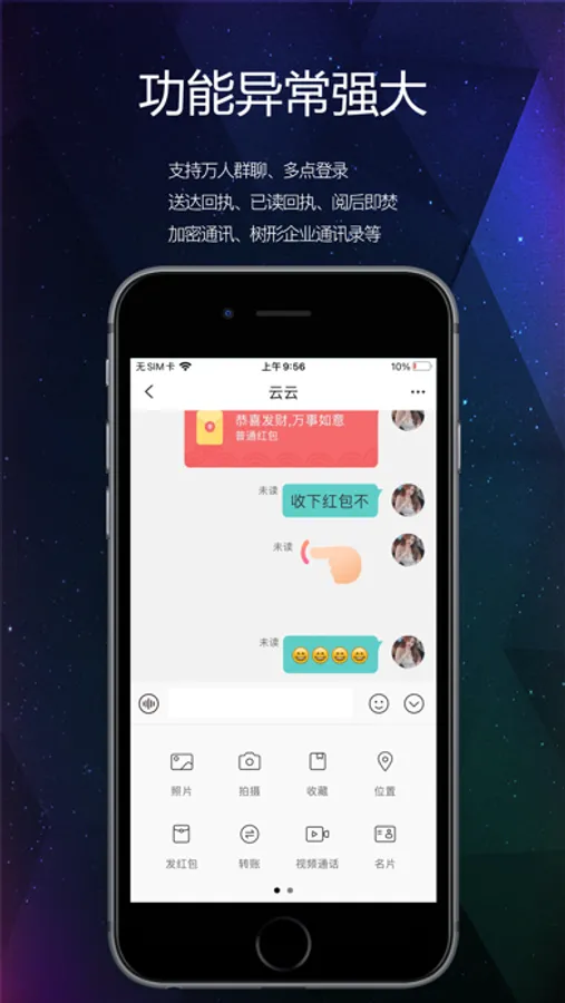 4. message, support long text, pictures, recording, video, business card, location, animation, archives, red packets, screenshots and other types.