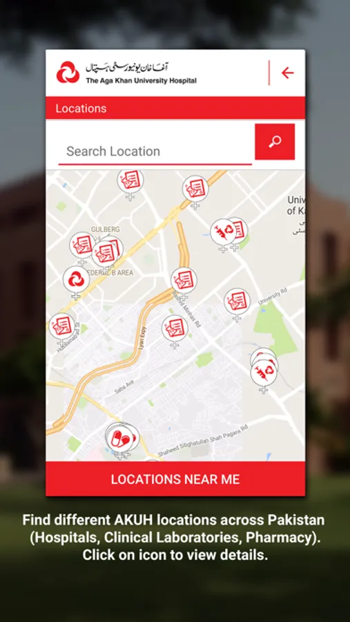 - Find and navigate to AKUH locations (Hospitals, Medical Centers, Laboratories, and Pharmacy) in Pakistan