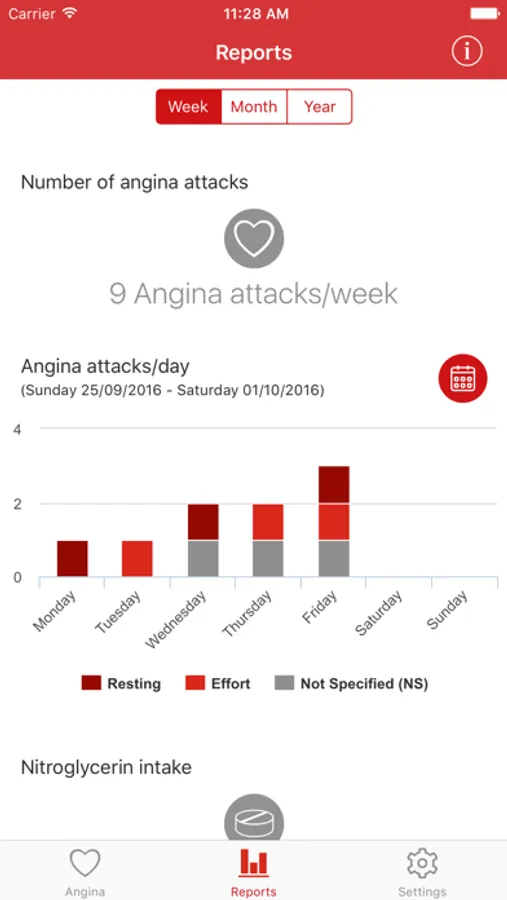 The application’s reporting function will enable doctors to follow the evolution of their patients’ angina attacks over time. For this purpose, AnginaControl displays the data by week, month, or year, in graphs showing: