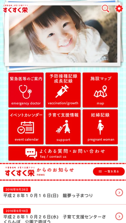 子どもの生年月日、性別、お住まいの地区をご登録いただき、ご登録した情報に合った最新のお知らせを栄町から配信します。