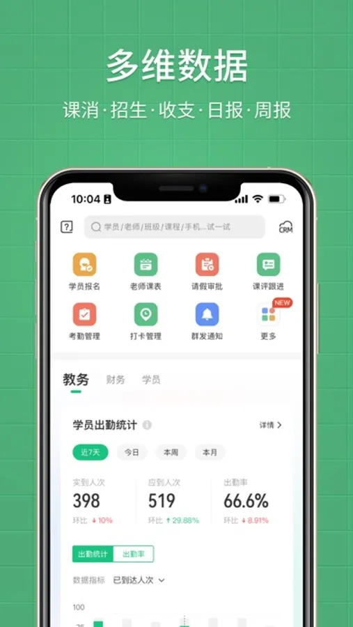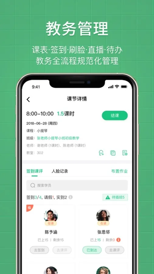 支持建班排课、考勤点名、消课课时记录、课评作业打卡、财务统计分析、家校沟通