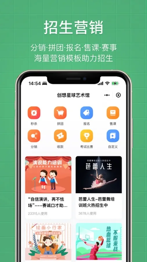 ●招生营销:活动制作;商品售卖;优惠券;转介绍;分销;拼团;招生数据统计;学员画像分析
