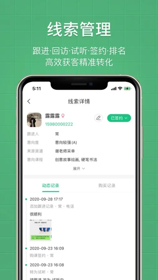 ●销售管理:线索导入;线索跟进;安排试听;签单购课;销售统计;转化分析
