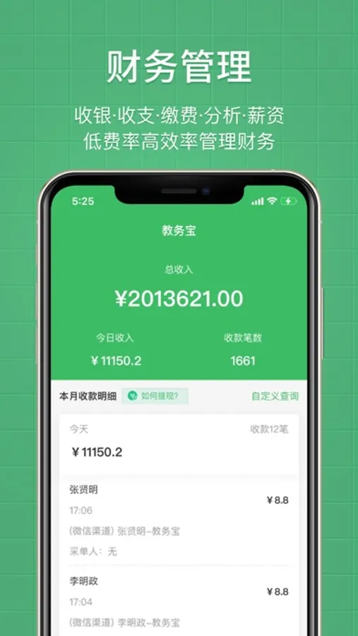 ●财务管理:多维度数据统计;财务收支统计;物品出入库统计;学员新签、续费、转课、退费;教师工资结算;经营数据分析