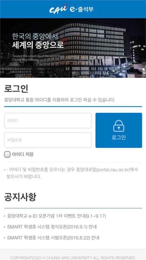 - 아이디 및 패스워드 분실 시 중앙대 포탈(portal.cau.ac.kr)에서 찾으시기 바랍니다.